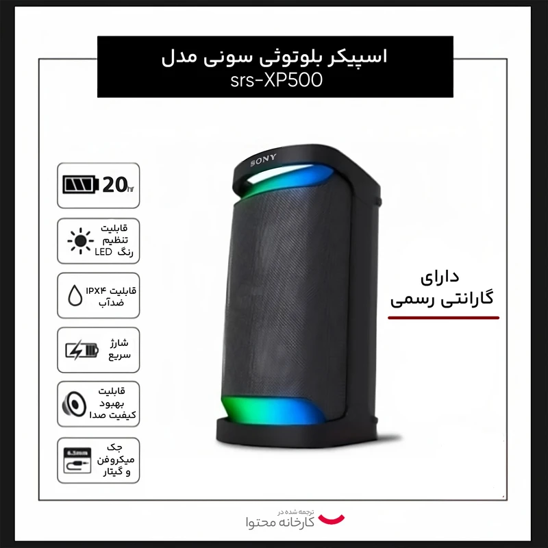 اسپیکر Sony XP500 با طراحی X-Balanced، دارای دو ووفر بزرگ و دو تیوتر برای صدای قدرتمند و بیس عمیق است. این مدل مقاوم در برابر آب (IPX4) بوده و تا ۲۰ ساعت پخش مداوم دارد.اگر به دنبال اسپیکری هستی که هم در فضای باز بتونی استفاده کنی و هم مهمانیها رو به سطح بعدی ببری، XP500 گزینهای هوشمند و آیندهنگره.